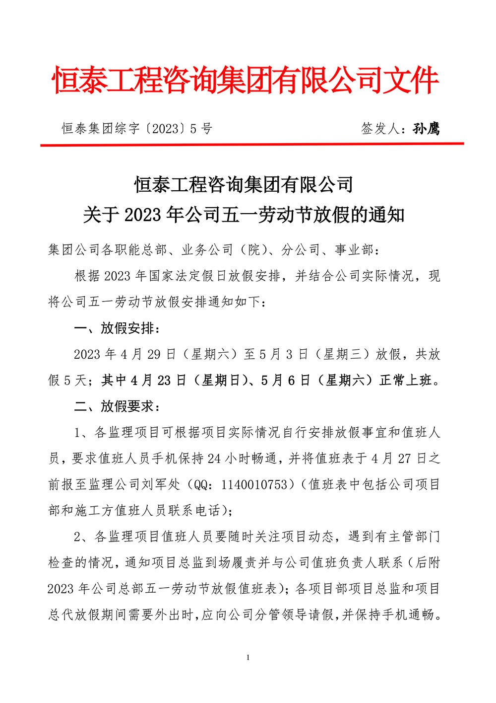 恒泰工程咨询集团有限公司 关于2023年端午节放假的通知